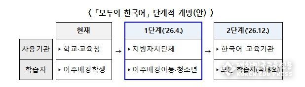 [대한민국교육신문] 교육부와 한국교육학술정보원(원장 정제영)은 국정과제 101번 ‘교육격차 해소를 위한 공교육 강화’의 일환으로, 이주배경학생 한국어교육을 위해 운영 중인 '모두의 한국어' 시스템의 사용기관과 학습자 범위를 단계적으로 확대한다고 밝혔다.