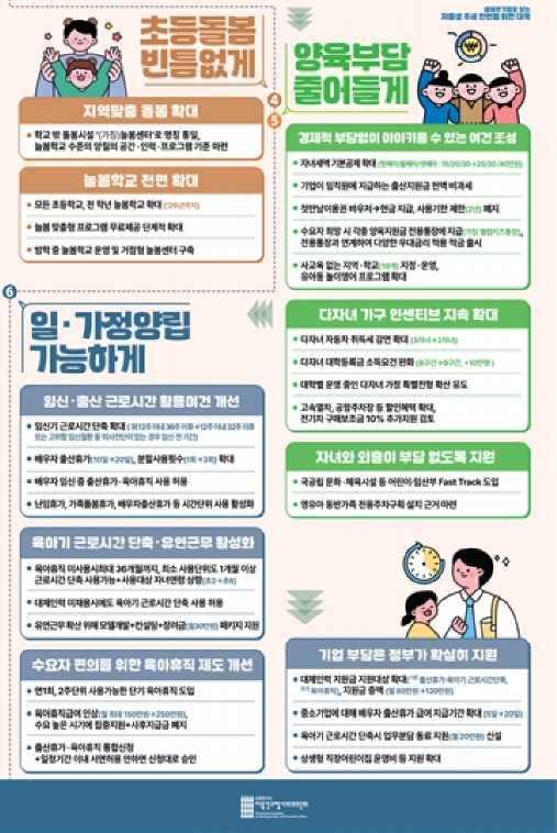 저출생의 직접적 원인이 되고 있는 ➊일‧가정 양립, ➋양육, ➌주거 등 3대 핵심분야 지원에 역량을 집중하고, 좋은 일자리 창출, 과도한 경쟁완화를 위한 공교육 내실화, 지방균형발전 등 구조적 요인에 대해서도 지속적으로 대응해 나갈 계획입니다.