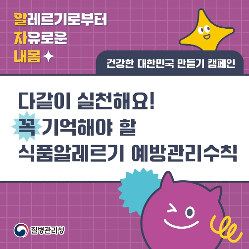 질병관리청은 이처럼 식품알레르기를 바르게 알리고 예방관리의 중요성을 널리 알리고자 2023년에 식품알레르기 예방관리 수칙을 제정·배포했으며, 이번 알레르기주간을 맞아 지자체 및 시도 아토피·천식 교육정보센터와 합동 홍보를 추진한다.