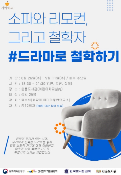 [대한민국교육신문] 파주 한울도서관이 문화체육관광부가 주관하고 한국문화예술위원회와 한국도서관협회에서 운영하는 ‘2024년 지혜학교’ 공모사업에 선정되어 ‘드라마로 철학하기’ 프로그램을 6월 26일부터 운영한다.