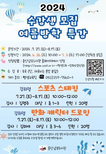 [대한민국교육신문] 울산남부도서관은 오는 7월 27일부터 8월 17일까지 매주 토요일마다 초등학생을 대상으로 ‘2024 여름방학 특강’을 운영한다.