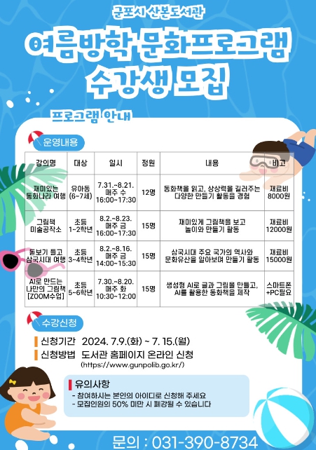 [대한민국교육신문] 군포시 산본도서관에서는 여름방학을 맞이하여 어린이들의 즐거운 방학생활을 함께할 다양한 프로그램을 운영한다.