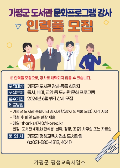 인력풀이란 향후 있을 문화프로그램을 운영하기 위해 강사 명단을 미리 확보하는 것으로, 가평군 도서관에서 문화프로그램 기획 시 반영된다. 다만, 채용이 아닌 인력풀 등록 희망자 모집이므로 인력풀에 등록되더라도, 강사로 채택되지 않을 수 있다는 점은 유의해야 한다.
