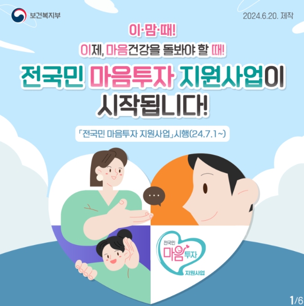 [대한민국교육신문] 보건복지부는 7월 1일부터 우울·불안 등 정서적 어려움이 있는 국민에게 전문 심리상담 서비스를 제공하는'2024년 전국민 마음투자 지원사업'을 시작한다고 밝혔다.