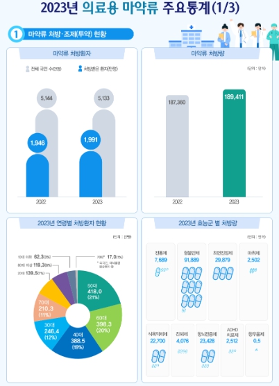 식약처는 2019년부터 매년 의료용 마약류 취급현황을 발표하고 있으며, 이번에는 2023년 1월 1일부터 2023년 12월 31일까지 의료용 마약류 처방・조제(투약) 현황, 마약류 취급자 수, 마약류 제조・수입・수출 실적 등 국내 의료용 마약류 취급현황과 변화 등을 제공했다.