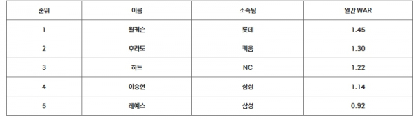 ‘쉘힐릭스플레이어’는 WAR(대체 선수 대비 승리 기여도)을 기반으로 선정하며, 6월 투수 부문에서는 롯데 윌커슨이 WAR 1.45로 1위를 차지했다. 윌커슨은 5월과 6월 선발 등판한 10경기 동안 9번의 퀄리티 스타트를 달성하고, 특히 지난 4일에는 KIA를 상대로 시즌 1호 완봉승을 거두기도 했다. 6월 한달간 가장 많은 이닝인 36 2/3이닝을 소화하면서도 이닝당 출루허용율인 WHIP도 4번째로 낮은 1.04를 기록했다. 윌커슨은 "포수가 리드를 잘해줬고, 타자들도 좋은 타격을 보여주며 도움을 많이 받았다. 후반기에도 팀에 보탬이 될 수 있도록 노력하겠다."며 쉘힐릭스플레이어 선정 수상 소감을 밝혔다.