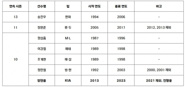 이와 함께 이번 시즌 91 2/3이닝을 던진 양현종은 KBO 통산 3번째로 11시즌 연속 100이닝 투구 기록 달성도 눈앞에 두고 있다. 앞으로 8 1/3이닝만 채우면 송진우(전 한화), 장원준(전 두산)만이 보유하고 있던 기록에 7년 만에 3번째로 이름을 올리게 된다.