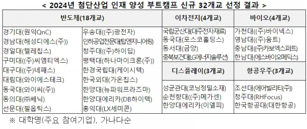 2024년에는 보다 많은 대학생들에게 현장감 있는 교육을 제공하기 위해 이차전지, 디스플레이, 바이오, 항공·우주까지 분야를 넓히고, 지원 대학도 대폭 확대했다. 올해 본 사업에 58개 대학이 사업계획서를 제출했으며, 6월 18일(화)부터 6월 26일(수)까지 진행된 평가를 통해 32개교를 선정했다.