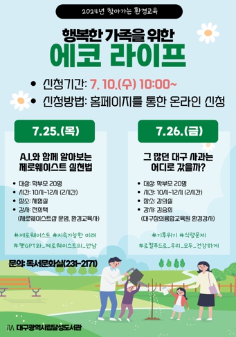 [대한민국교육신문] 대구달성도서관은 오는 7월 25일부터 26일까지 이틀동안 학부모를 대상으로 2024년 찾아가는 환경교육 '행복한 가족을 위한 에코 라이프'를 운영한다.