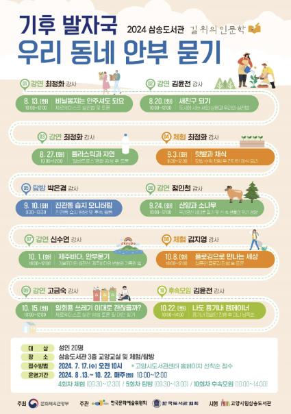 [대한민국교육신문] 고양특례시 삼송도서관은 문화체육관광부가 주최하고 한국문화예술위원회, 한국도서관협회가 주관하는‘길 위의 인문학’ 공모사업에 선정돼 8월부터 10월까지 환경을 주제로 한‘기후발자국, 우리 동네 안부 묻기’프로그램을 운영한다고 16일 밝혔다.