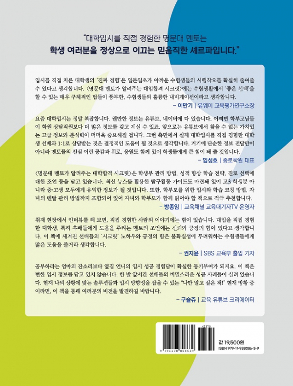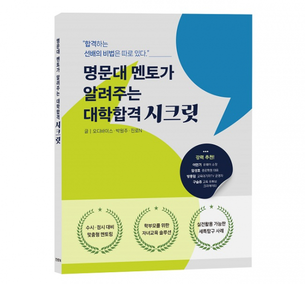 신간 ‘명문대 멘토가 알려주는 대학합격 시크릿’에는 대학 입시의 ‘셰르파’인 대학생 멘토들이 알려 주는 입시 준비 노하우가 가득 담겨있다. 학생들은 비슷한 악조건을 이겨내고 정상에 다다른 선배들의 이야기를 통해, 입시 노하우는 물론이고 선배들의 경험에서 우러난 진심 어린 공감과 응원을 얻을 수 있다.