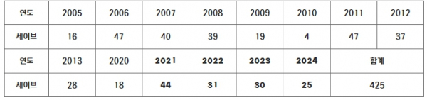 이번 시즌 25개의 세이브로 부문 1위를 달리고 있는 오승환은 역대 첫 번째 4시즌 연속 30세이브까지도 5개만을 남겨두고 있다.