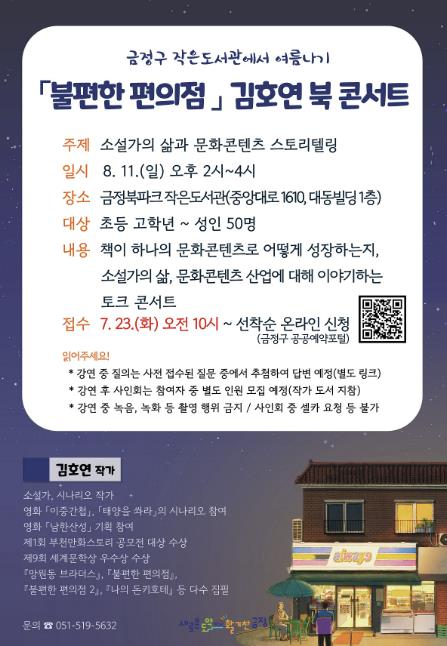 [대한민국교육신문] 부산시 금정구는 오는 8월 11일 오후 2시, 부곡동에 위치한 금정 북파크 작은도서관에서 ‘김호연 작가와의 만남’를 개최한다.