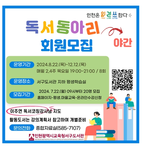 [대한민국교육신문] 인천광역시교육청서구도서관은 성인 대상 야간 독서동아리 참여자를 22일부터 모집한다.