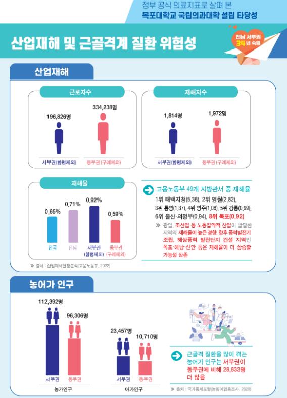 [대한민국교육신문] 목포시가 산업재해 현황 분석(고용노동부, 2022), 국가통계포털(농림어업총조사, 2020)등의 정부공식자료 분석을 토대로 전남서부권 의대유치 주장을 꾸준히 이어가고 있다.