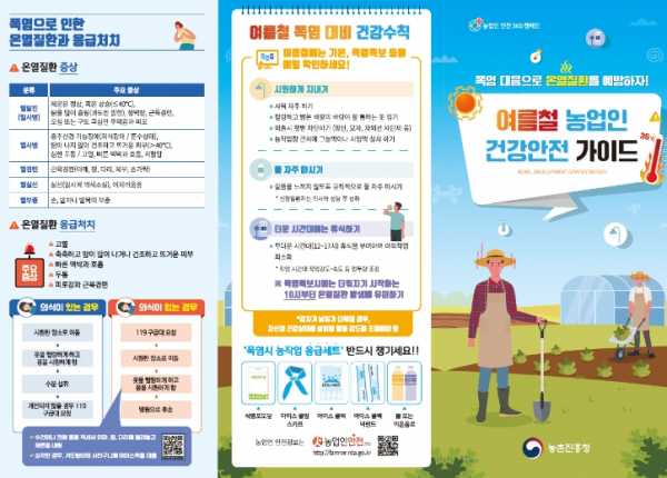 농촌진흥청은 여름철 농업인 온열질환 예방과 안전한 농작업 예방수칙 안내문을 제작해 지방 농촌진흥기관과 전국 농촌인력중개센터 등에 배포했다. 아울러 ‘농업인안전365(farmer.rda.go.kr)’ 누리집과 농업기술 포털 ‘농사로’에도 게시했다.