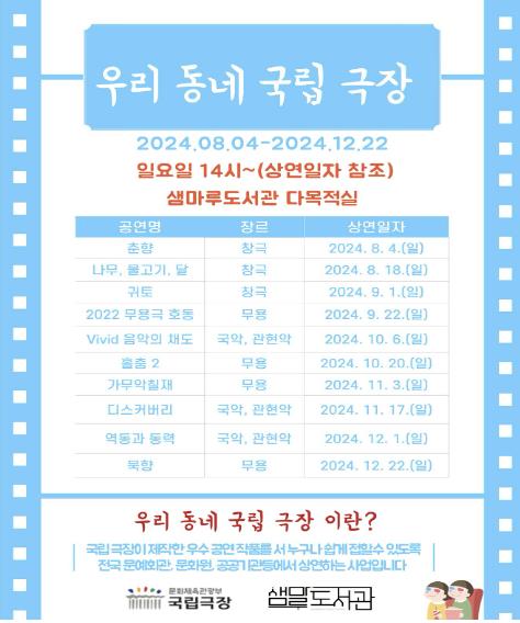 [대한민국교육신문] 샘마루도서관은 오는 8월 4일부터 ‘2024년 우리 동네 국립극장’ 프로그램을 운영한다.