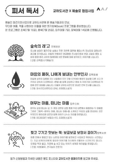 8월 14일 말복은 오후 2시 30분, 방학을 맞은 어린이 가족 행사를 마련했다. ’찢고 구기고 맛보는 책-보글보글 보양서 꾸미기‘는 배우이자 연극놀이 전문가 박영과 함께 한다. 훼손된 폐기도서와 잡지를 찢으며 스트레스를 날리고, 나만의 이야기를 만들어본다. 참여 신청은 교하도서관 누리집에서 할 수 있다.