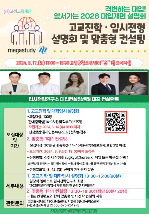 한편, 맞춤형 1:1 컨설팅을 희망하는 학생은 8월 9일까지 참가신청서를 (재)고성교육재단 방문 또는 이메일 제출하면 되며, 별도 선정기준에 따라 선정된 20팀(학생 및 학부모)만 컨설팅을 받을 수 있다.