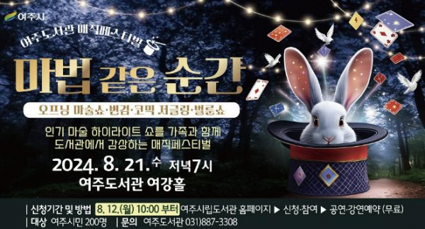 [대한민국교육신문] 여주도서관 여강홀에서 오는 8월 21일 수요일 저녁 7시, 인기 마술 하이라이트 쇼 '마법 같은 순간'을 공연한다.