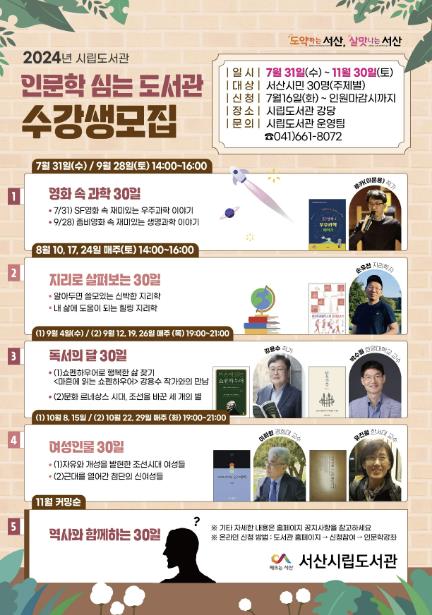 시는 서산시립도서관 강당에서 매월 특정한 주제를 선정해 맞춤형 특강을 제공하는 ‘인문학 심는 도서관’을 7월부터 12월 초까지 운영한다고 29일 밝혔다.