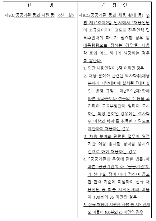 지난 2월 「지방대육성법」이 개정되어 비수도권 공공기관에서 신규 직원 채용 시 신규 채용인원 중 지역인재 채용 비율을 35% 이상으로 의무화하였다. 다만, 비수도권 공공기관의 인사와 운영의 자율성을 확보하고자 채용 인원이 소규모이거나 고도의 전문인력 및 특수인력의 확보가 필요한 경우 등 지역인재 의무채용 예외를 대통령령으로 정하도록 하였다.