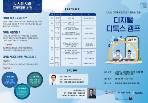 디지털 디톡스 캠프에서는 ▲디지털 과몰입 대응 및 예방 특강 ▲청소년 디지털 범죄 사례 및 예방 특강 ▲스마트폰을 대신하는 아날로그의 즐거움 활동 소그룹 순환 체험으로 구성했으며 연세대학교 대학생 홍보대사 멘토링과 연계해 체험 활동이 진행됐다.