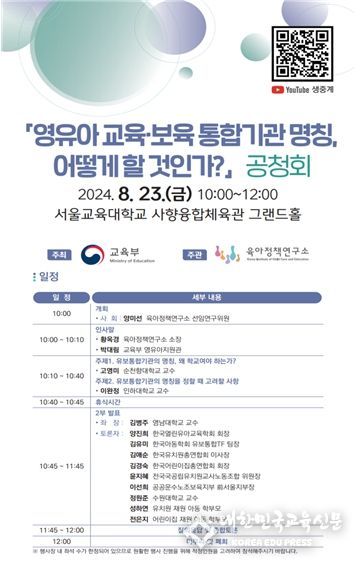[대한민국교육신문] 교육부와 육아정책연구소는 8월 23일, 서울교육대학교에서 영유아 교육·보육 통합기관 명칭에 대한 의견을 수렴하기 위해 대국민 공청회를 개최한다.