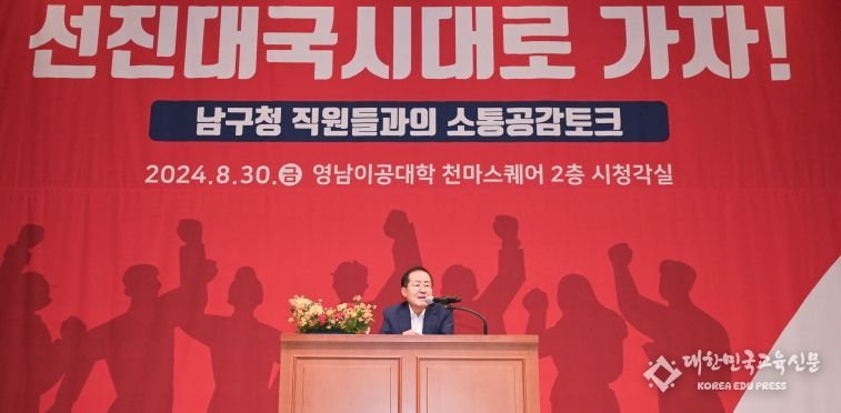 [대한민국교육신문] 대구광역시는 8월 30일 오후 3시 남구 영남이공대학 천마스퀘어 시청각실에서 ‘선진대국시대로 가자!’ 라는 주제로 홍준표 대구광역시장과 남구청 직원들과의 소통·공감의 시간을 가졌다.