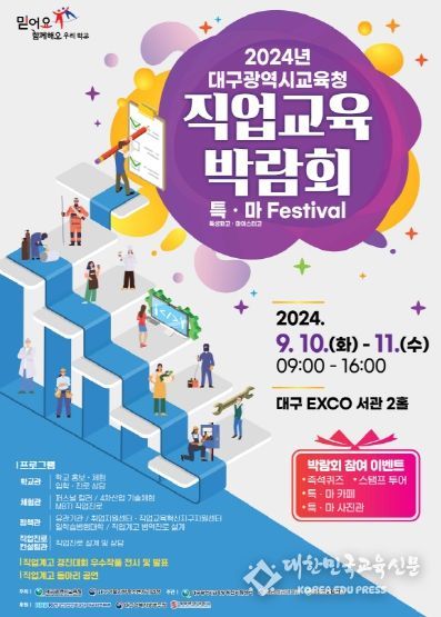 [대한민국교육신문] 대구시교육청은 9월 10일부터 9월 11일까지 2일간 대구 엑스코 서관 2홀에서 2024. 대구광역시교육청 직업교육박람회 ‘특·마 Festival’행사를 개최한다.