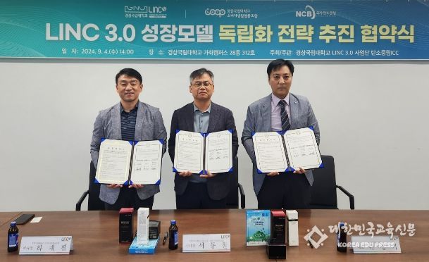 [대한민국교육신문] 경상국립대학교 산학연협력 선도대학 육성사업단 탄소중립 ICC는 9월 4일 오후 가좌캠퍼스에서 경상국립대 소비자생활협동조합, 국가탄소은행과 ‘LINC 3.0 성장모델 독립화 전략 추진 업무협약’을 체결했다.